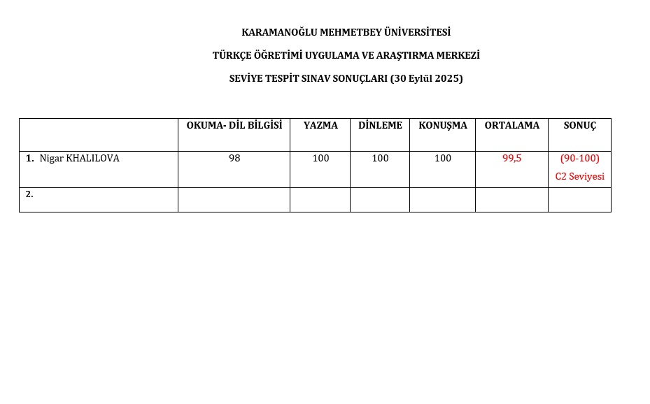 KMÜ TÖMER YABANCI UYRUKLU ÖĞRENCİ SEVİYE TESPİT SINAVI