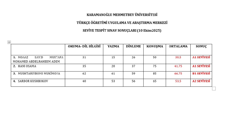 KMÜ TÖMER YABANCI UYRUKLU ÖĞRENCİ SEVİYE TESPİT SINAVI