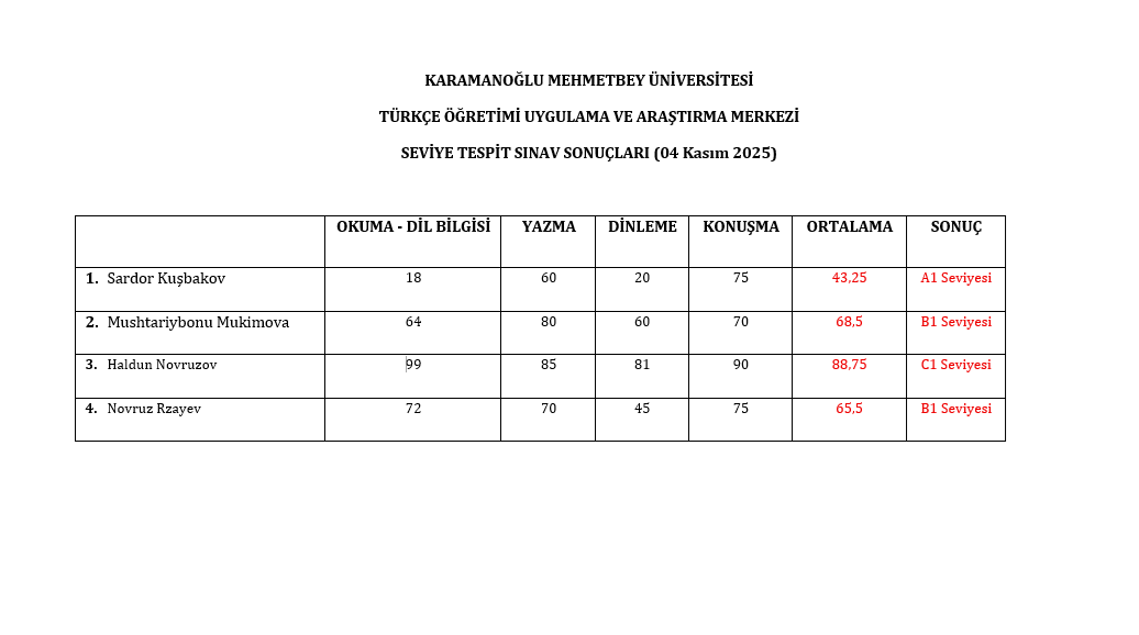 KMÜ TÖMER YABANCI UYRUKLU ÖĞRENCİ SEVİYE TESPİT SINAVI