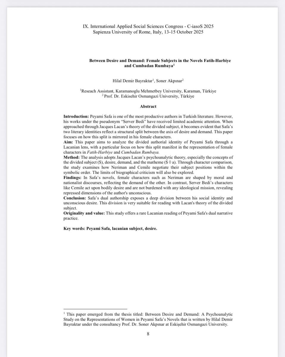 13-15 Ekim 2025 tarihleri arasında İtalya'nın başkenti Roma'da gerçekleşen IX. International Applied Social Sciences Congress'te Arş. Gör. Hilal DEMİR BAYRAKTAR, "Between Desire and Demand: Female Subjects in the Novels Fatih-Harbiye and Cumbadan Rumbaya" başlıklı bildirisini sundu.