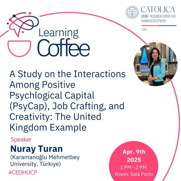 Bölümümüz değerli akademisyenlerinden Dr. Öğr. Üyesi Nuray Turan, 9 Nisan 2025 tarihinde Portekiz’in Porto şehrinde bulunan Universidade Católica Portuguesa bünyesindeki Research Centre for Human Development (CEDH) tarafından düzenlenen Learning Coffee etkinliğine davetli konuşmacı olarak katıldı.