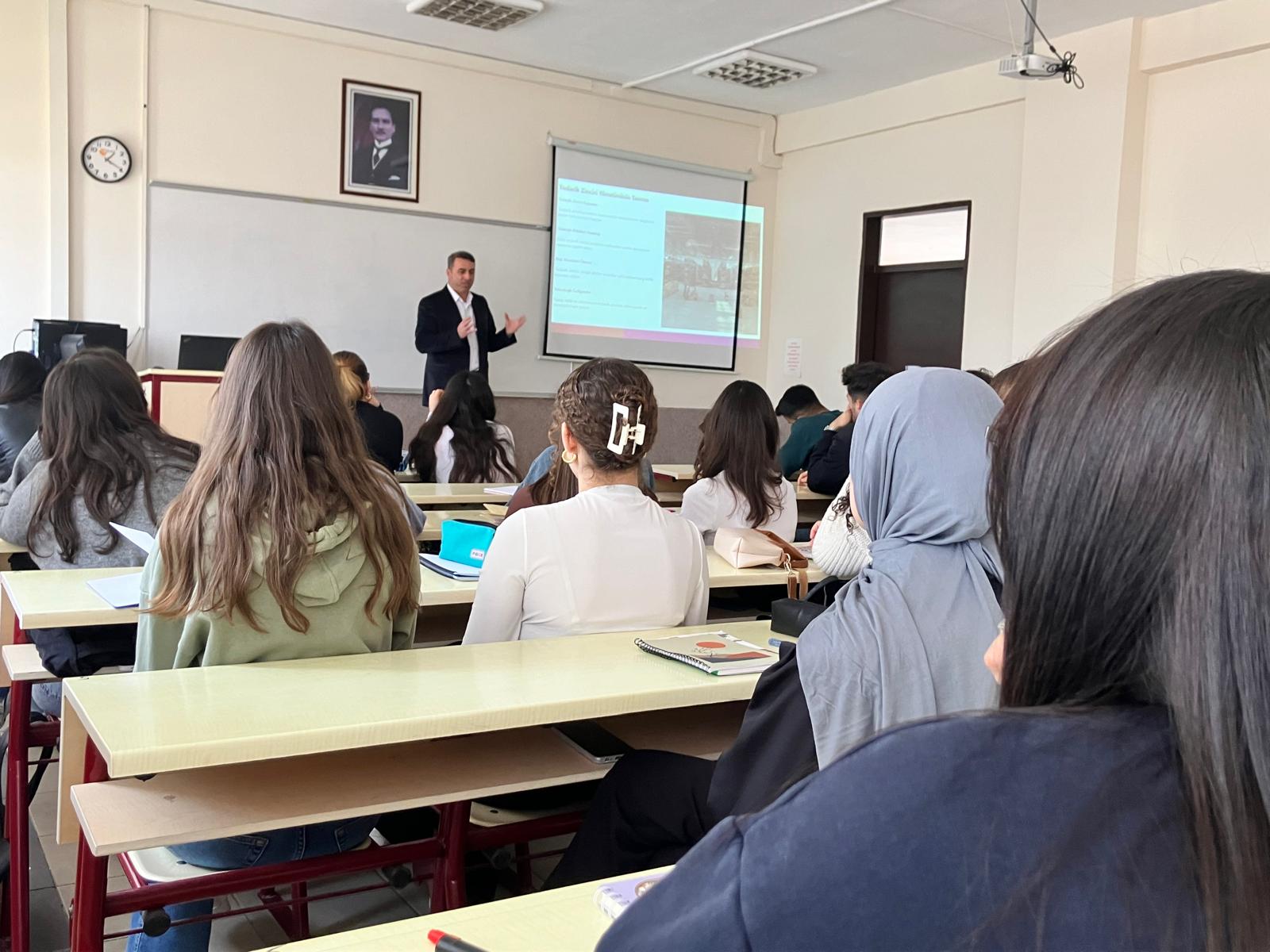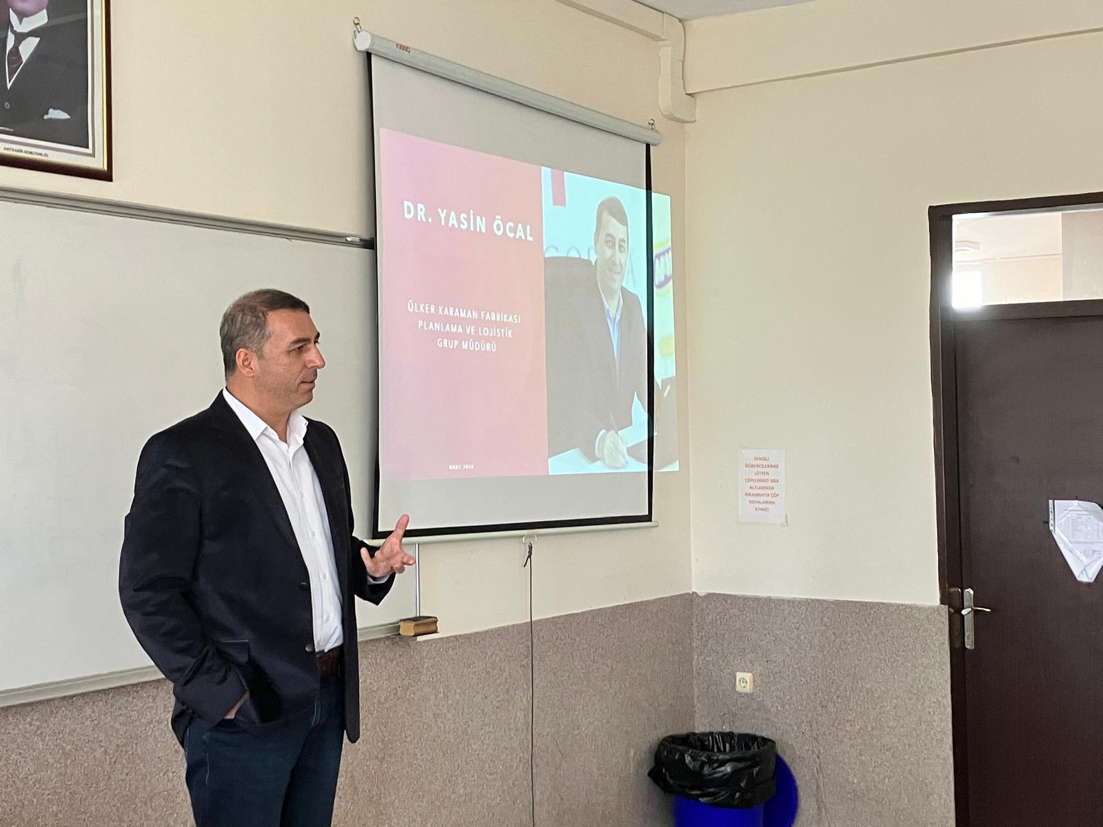 Gerçekleştirilen söyleşide Dr. Yasin Öcal, küresel ölçekte giderek önem kazanan tedarik zinciri yönetiminin şirketler açısından stratejik rolüne değinerek lojistik planlama süreçleri, operasyon yönetimi ve sektörün güncel dinamikleri hakkında öğrencilerle önemli bilgiler paylaştı. Uluslararası ticaretin hızla geliştiği günümüzde lojistik süreçlerin etkin yönetiminin kurumlar için büyük bir rekabet avantajı sağladığını vurguladı.