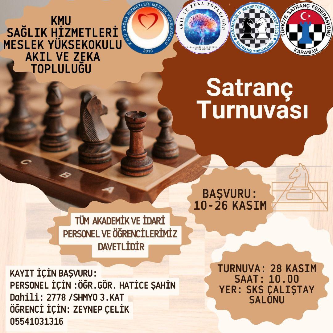 KMÜ Sağlık Hizmetleri Meslek Yüksekokulu Akıl ve Zeka Topluluğu ile Karaman Satranç İl Temsilciliğinin iş birliğinde 28.11.2025 tarihinde SKS Çalıştay Salonunda satranç turnuvası düzenlendi.Turnuvaya üniversitemiz Akademik ve İdari Personeli ve Öğrencilerin katılımı sağlandı. Dereceye giren ilk 3 katılımcıya madalyaları takdim edildi.