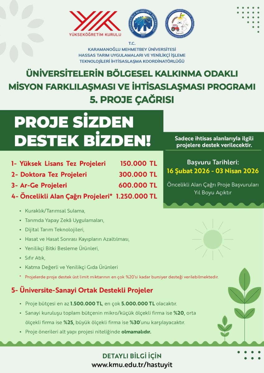 Karamanoğlu Mehmetbey Üniversitesi, Hassas Tarım Uygulamaları ve Yenilikçi İşleme Teknolojileri (HASTUYİT) İhtisaslaşma Koordinatörlüğü Proje Destek Programı 5. Proje Çağrısı kapsamında AR-GE ve Üniversite-Sanayi iş birliği ortak finansmanında proje başvuruları kabul edilecektir. Proje Başvurularınızı 03 Nisan 2026 tarihine kadar yapabilirsiniz.