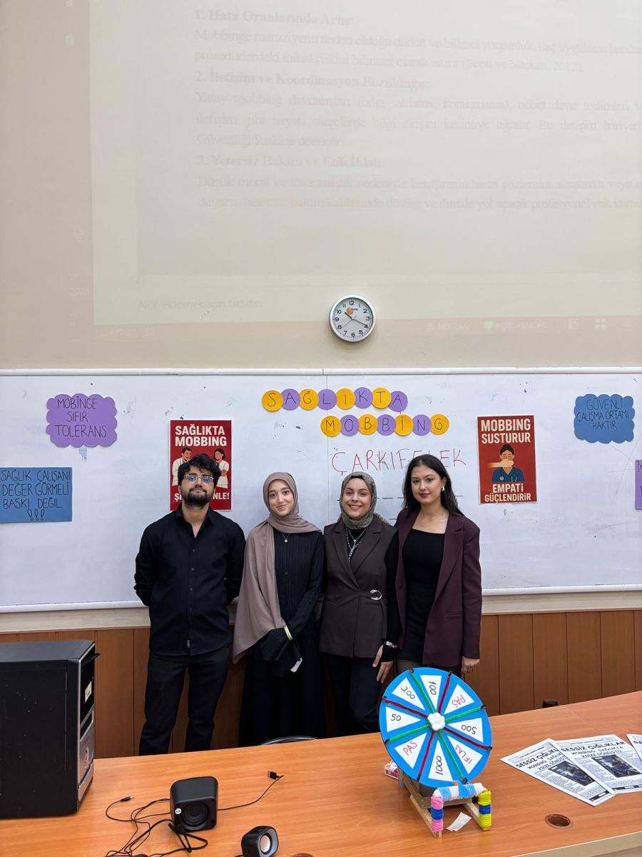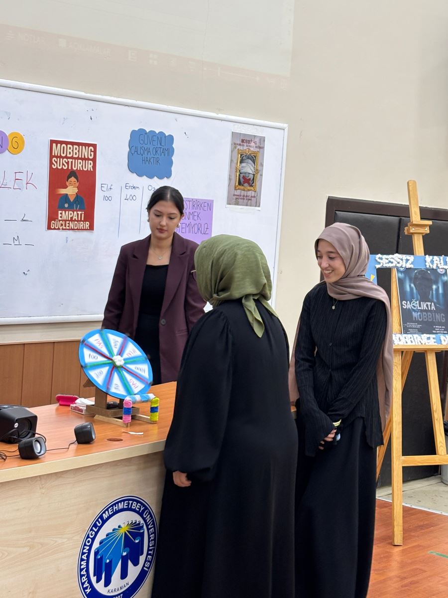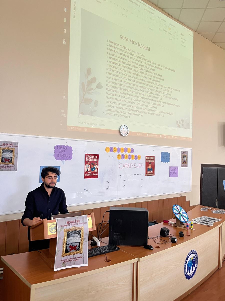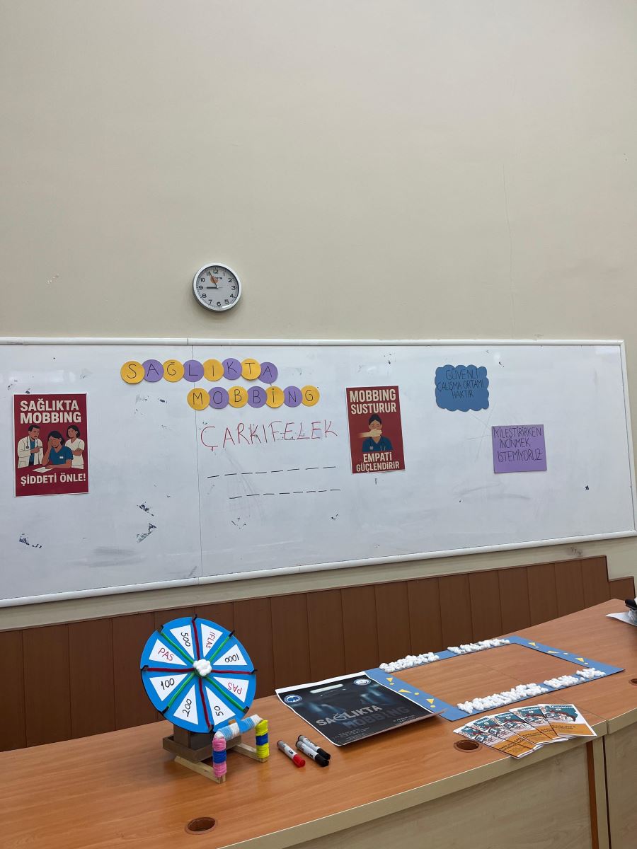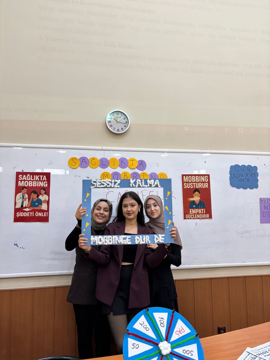 Etkinliğin sorumluluğunu Prof. Dr. Nejla CANBULAT ŞAHİNER ve Arş. Gör. Dr. Dilara ŞAHİN’in üstlendiği programda, sağlık çalışanlarının mesleki yaşamlarında karşılaşabildiği psikolojik baskı, yıldırma ve mobbing davranışlarının bireysel ve kurumsal etkileri ele alındı. Mobbingin çalışan sağlığı, iş verimliliği ve hizmet kalitesi üzerindeki olumsuz sonuçlarına dikkat çekilerek, farkındalık ve çözüm önerileri paylaşıldı. Katılımcıların konuya aktif katılımını sağlamak amacıyla etkinlik sırasında çarkıfelek oyunu oynatılarak, mobbing kavramına ilişkin sorular yöneltildi ve farkındalık artırıldı.