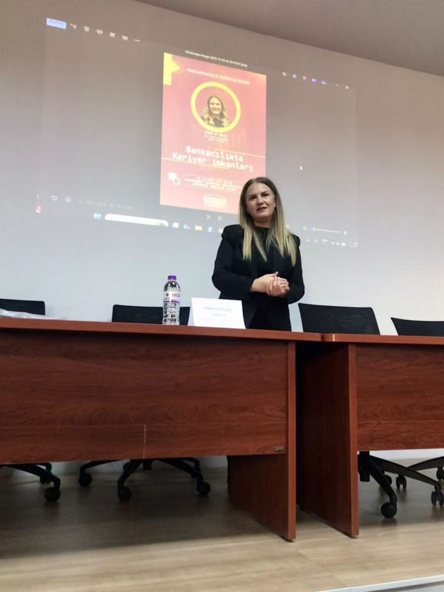 Konferansın konuşmacısı, QNB Bank Karaman Şube Müdürü Pınar Ay Güleç, bankacılık sektöründe kariyer planlaması, işe alım süreçleri, sektörde yükselme imkânları ve öğrencilerin dikkat etmesi gereken temel yetkinlikler hakkında kapsamlı bir sunum gerçekleştirdi. Katılımcılar, sektörün güncel yapısı ve bankacılık alanında kariyer hedefleyen öğrenciler için sunulan fırsatlar konusunda önemli bilgiler edinme fırsatı buldu.