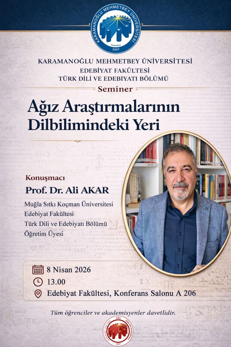 Muğla Sıtkı Koçman Üniversitesi Öğretim Üyesi Prof. Dr. Ali AKAR'ın "Ağız Araştırmalarının Dilbilimindeki Yeri" konulu semineri, fakültemiz konferans salonunda gerçekleştirilecek.