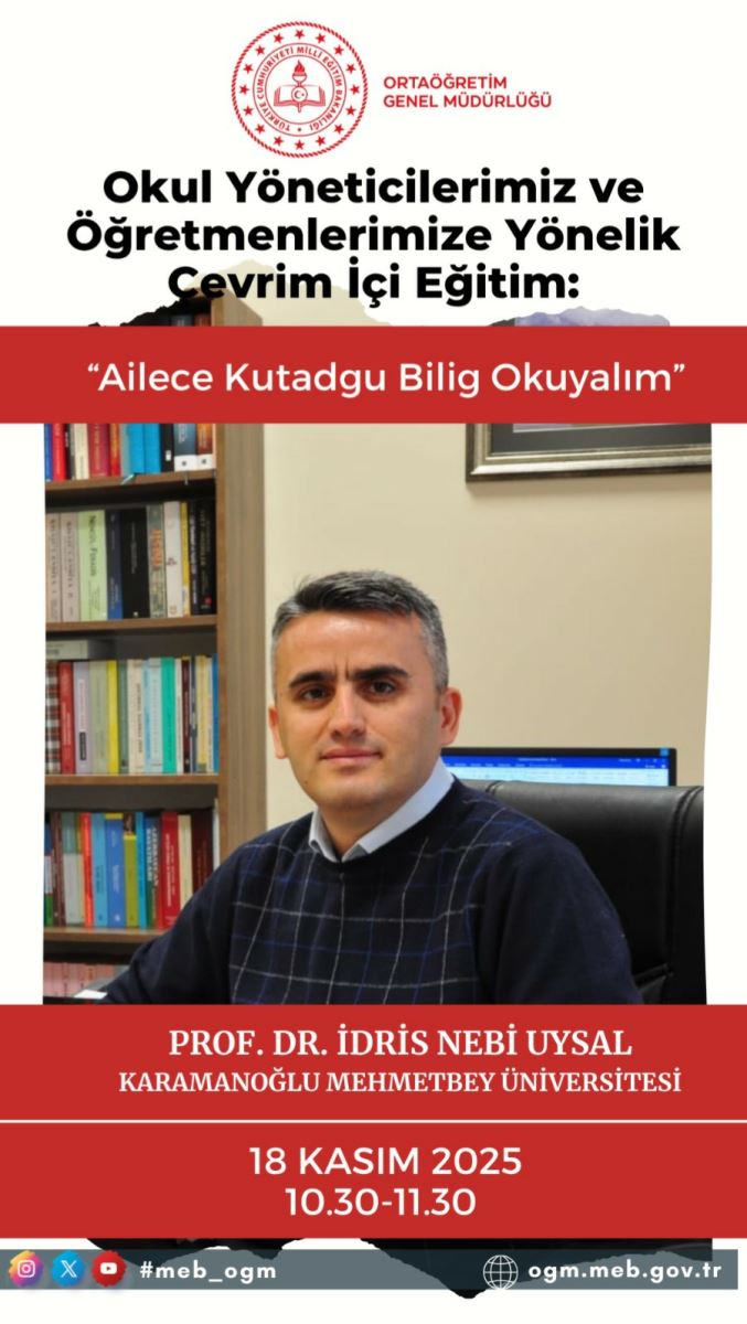 MEB Ortaöğretim Genel Müdürlüğü tarafından düzenlenen çevrim içi eğitiminde konuşan Prof. Dr. İdris Nebi UYSAL, "Ailece Kutadgu Bilig Okuyalım" çağrısı çerçevesinde kayda değer bilgiler paylaştı.